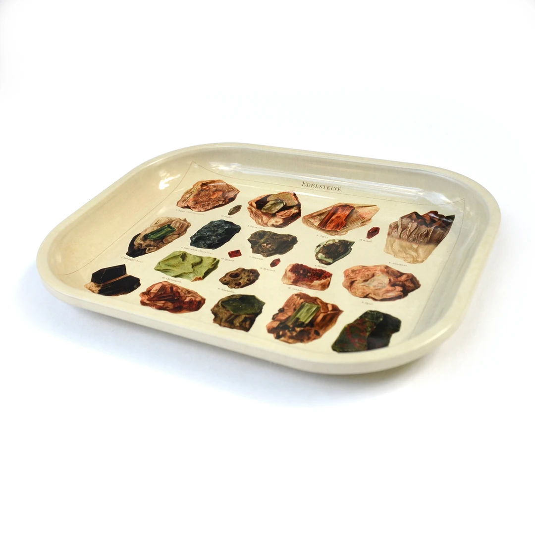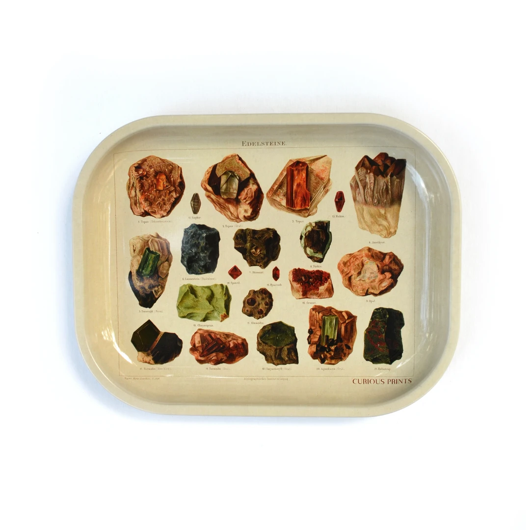 Crystals and Minerals Ritual Tray A vintage inspired tray for any of your rituals. 5″x7″ tray made of sturdy metal (will not bend). Features German vintage illustrations of a selection of minerals. Perfect as a catch-all tray, rolling tray, or use in your ritual space.