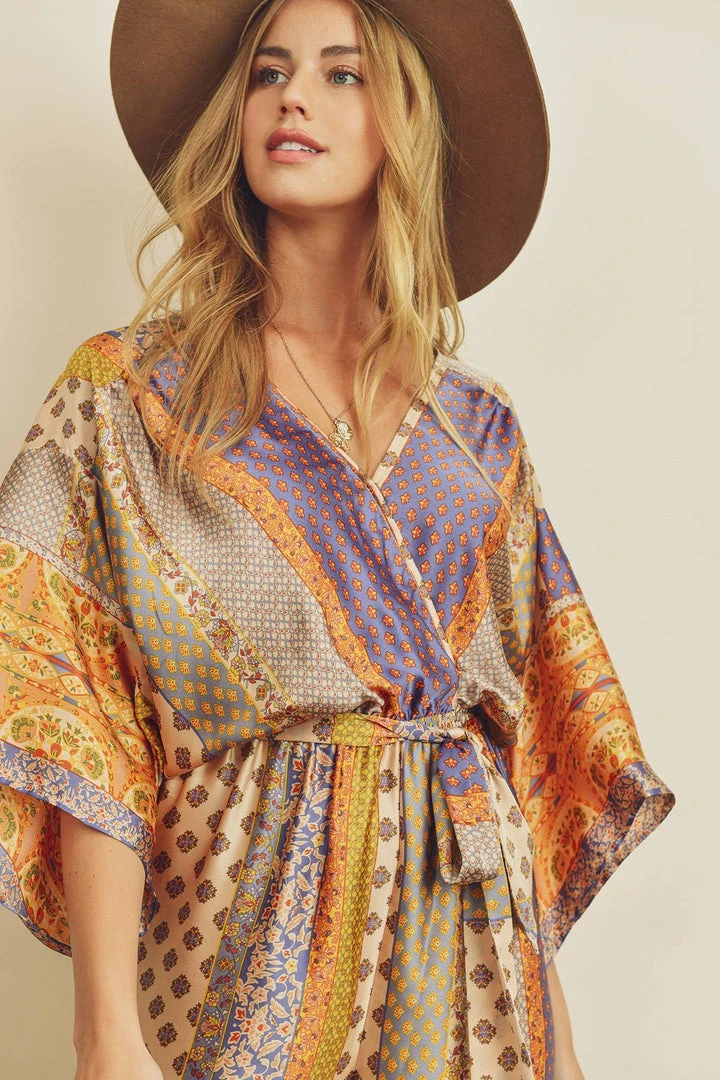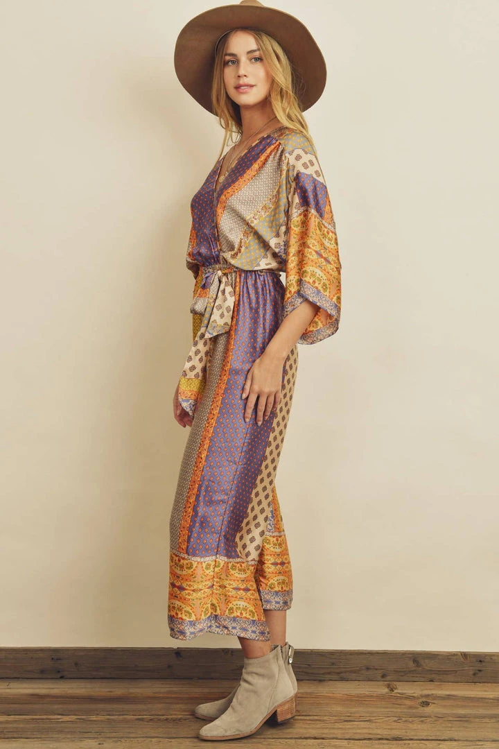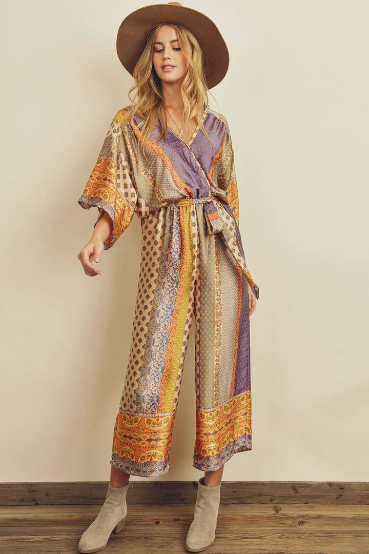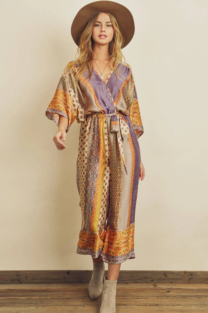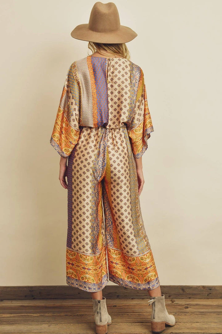 Multi-color paisley border print jumpsuit featuring kimono sleeves, cropped wide legs, and a surplice neckline(hidden snap button closure). Elasticized waistband with sash tie detail. Button closure and keyhole detail on the back neckline.
