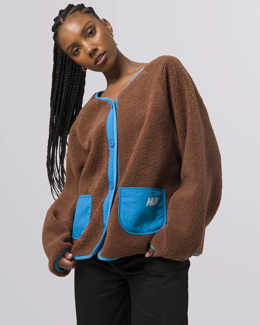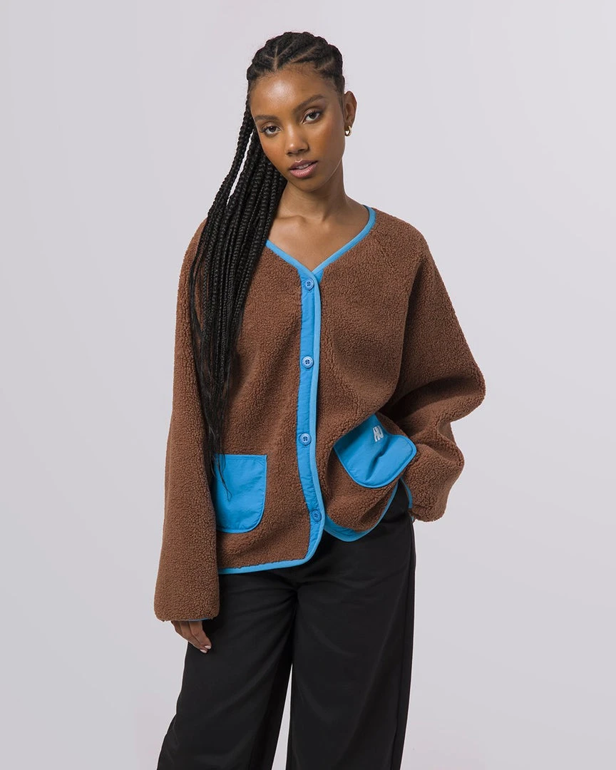 Inspired by classic military shell jackets, the 10K Sherpa Jacket is cut in a boxy oversized silhouette with a button front closure for easy layering. Made of super-soft Sherpa, the jacket features contrast-color Taslan nylon detailing in patch pockets at the front, an oversized pouch pocket at the back, down the placket, and at the trims. A must-have for holiday.
