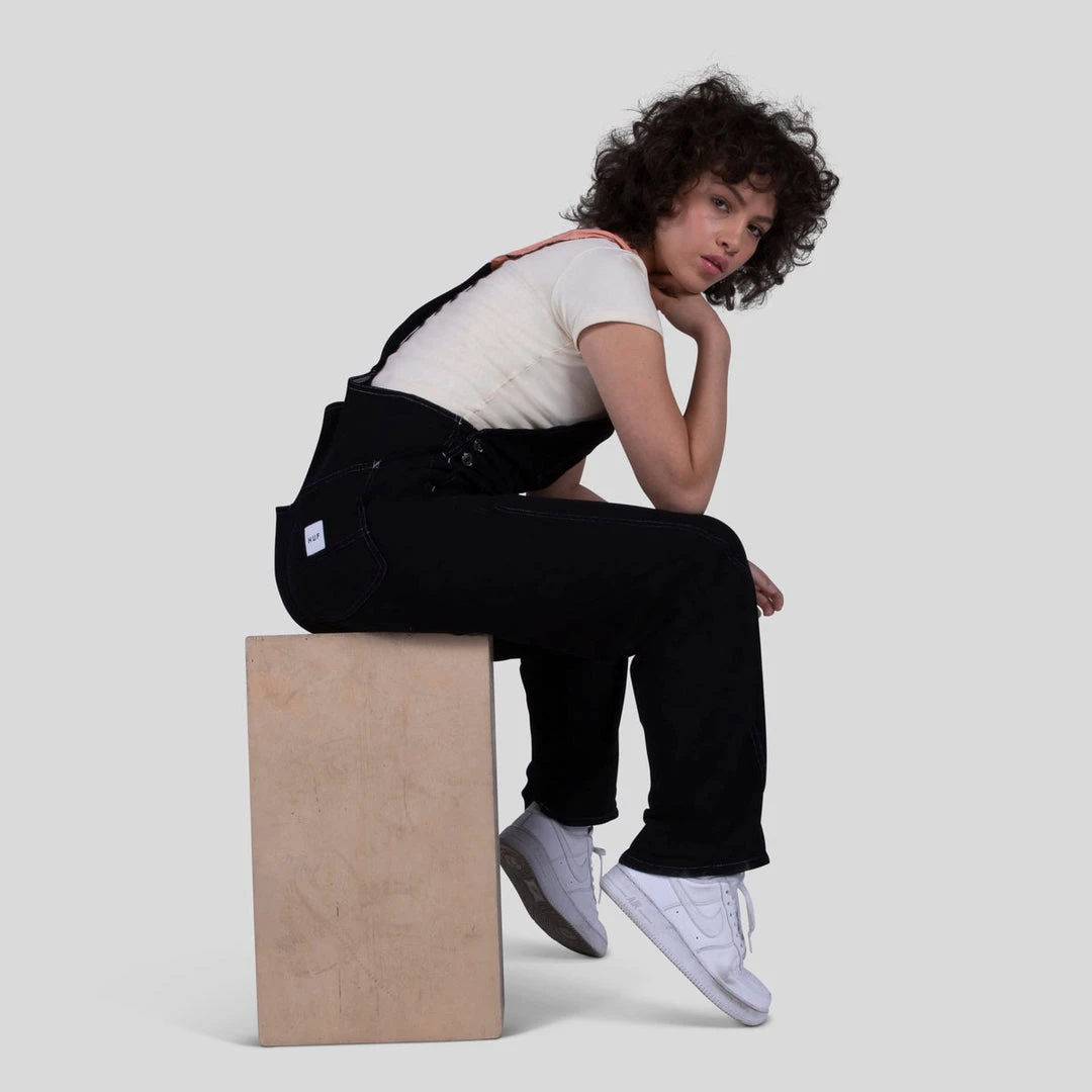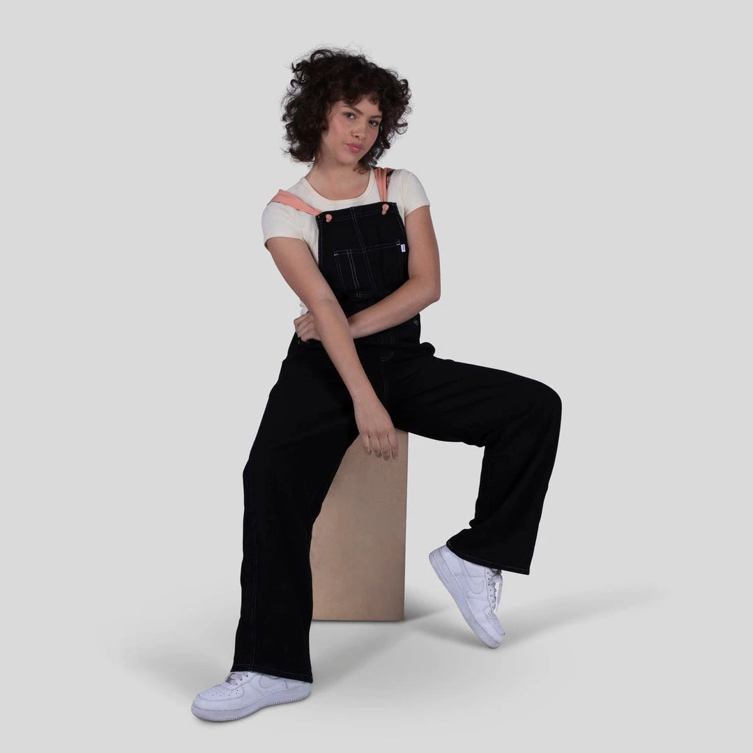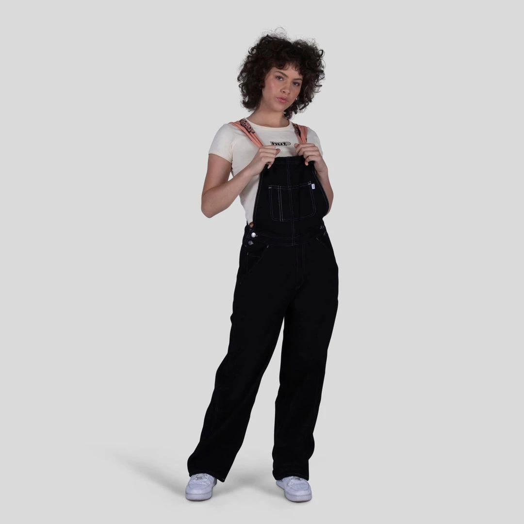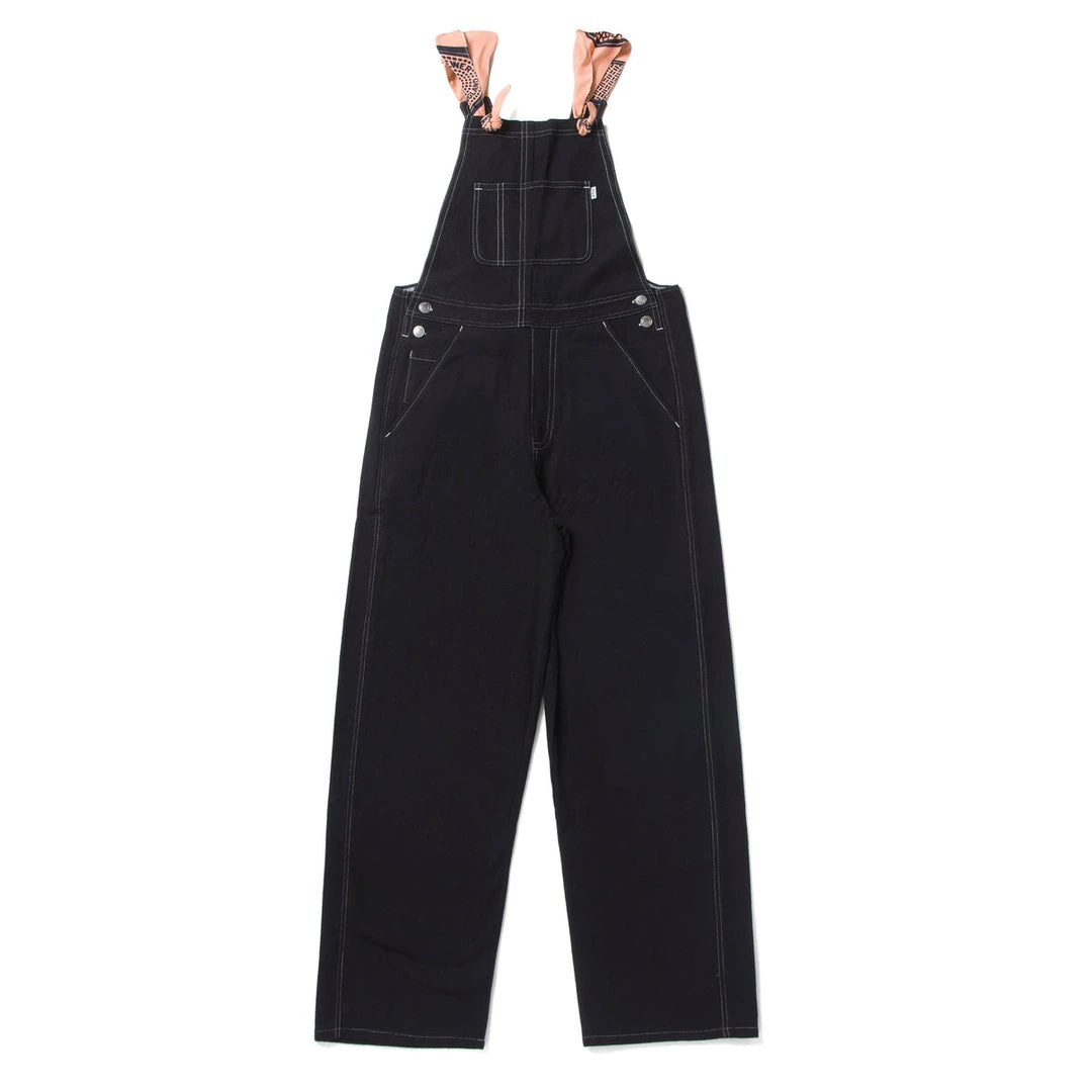 THE LIGHTWEIGHT OVERALL FEATURES HANDKERCHIEF STYLE ADJUSTABLE STRAPS WITH THE A/O DRAIN COVER ARTWORK.