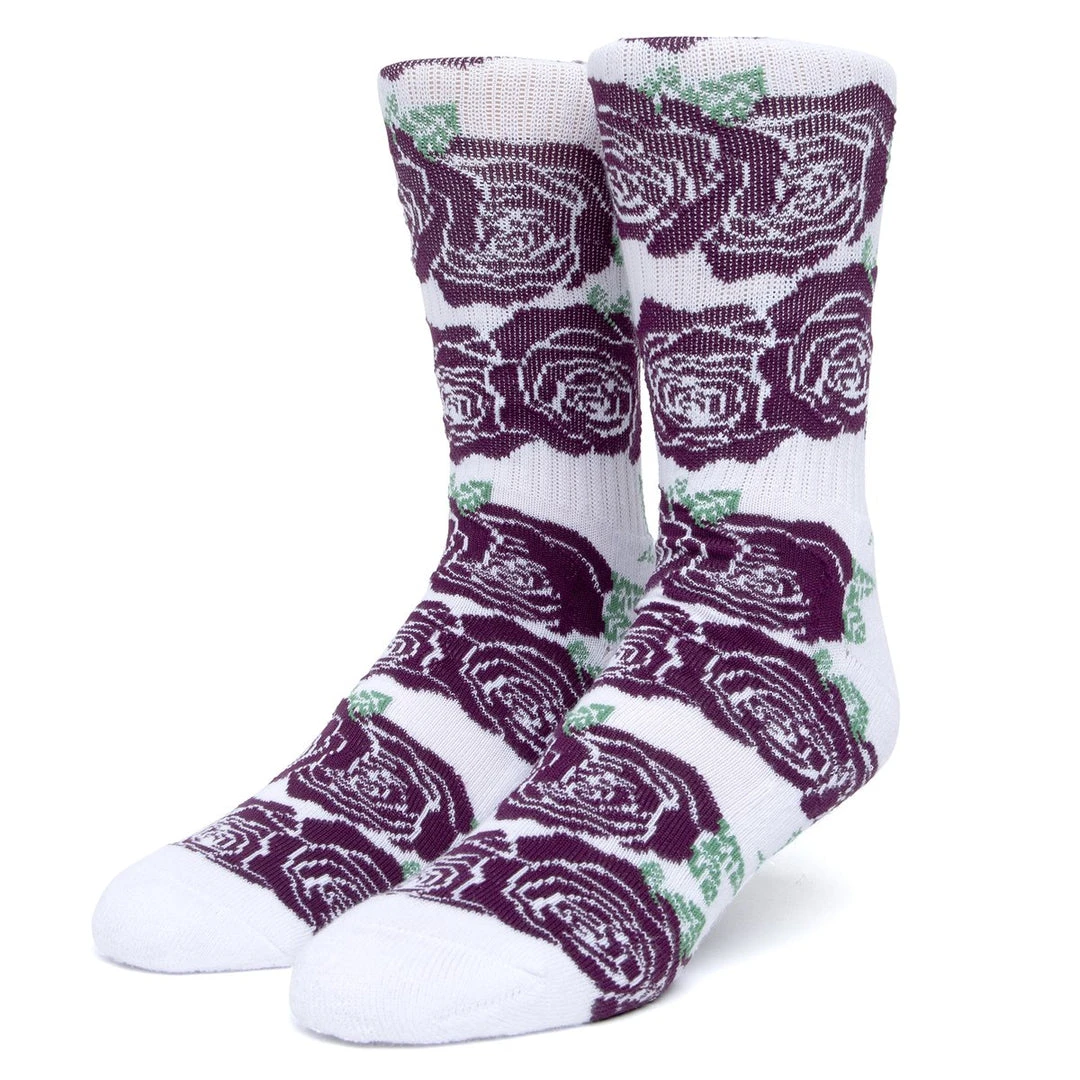 Be a lover, not a hater, with the HUF Rosette Socks. Featuring a jacquard-knit rose flower all-over repeat inspired by vintage tapestry patterns, and a HUF ‘Original Logo’ at instep. Cut in a soft cotton/poly blend at a classic crew-length, these socks are finished with a cushioned footbed and reinforced heel and toe for extra comfort. True HUF love.