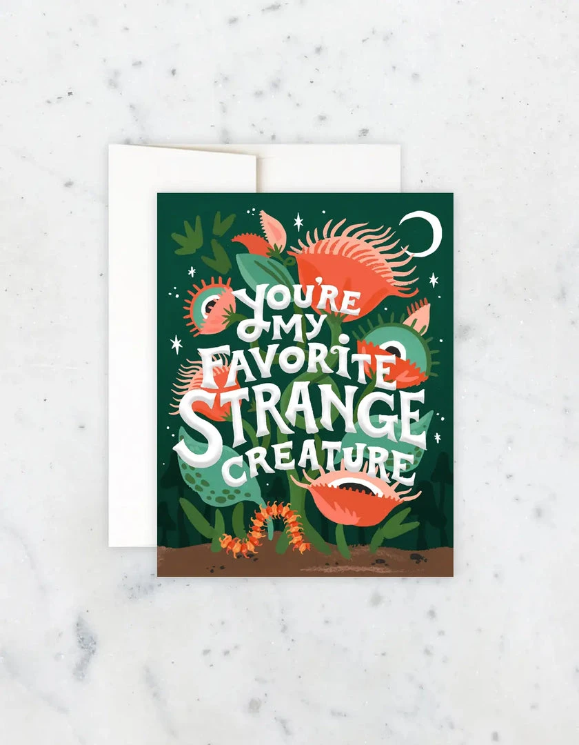 Fantastical, carnivorous plants adorn a starlit scene with pillow-embossed lettering. The perfect unique greeting for your favorite creature!
