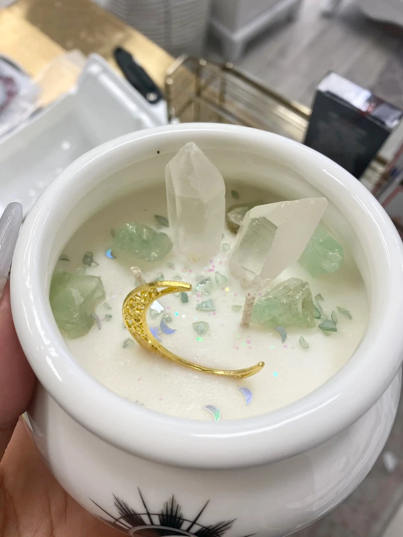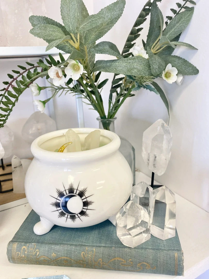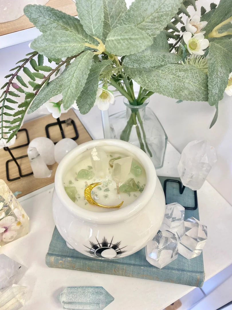 White ceramic cauldron topped with green calcite, Quartz points and a moon charm that can be used as a necklace. Moon charm will be sent in either gold, Silver or rose gold. Due to nature of. Crystals, size may vary.