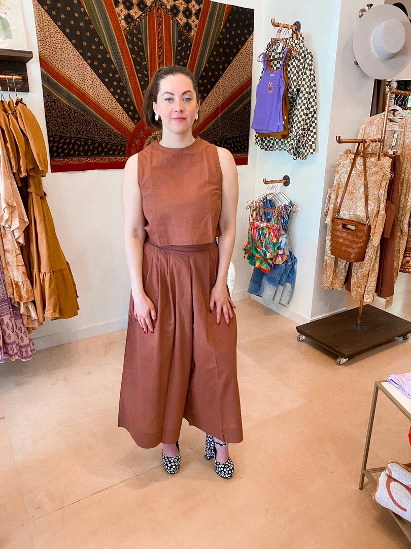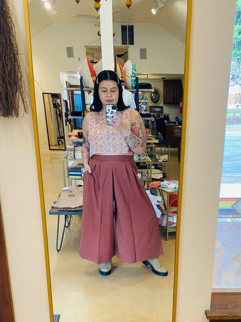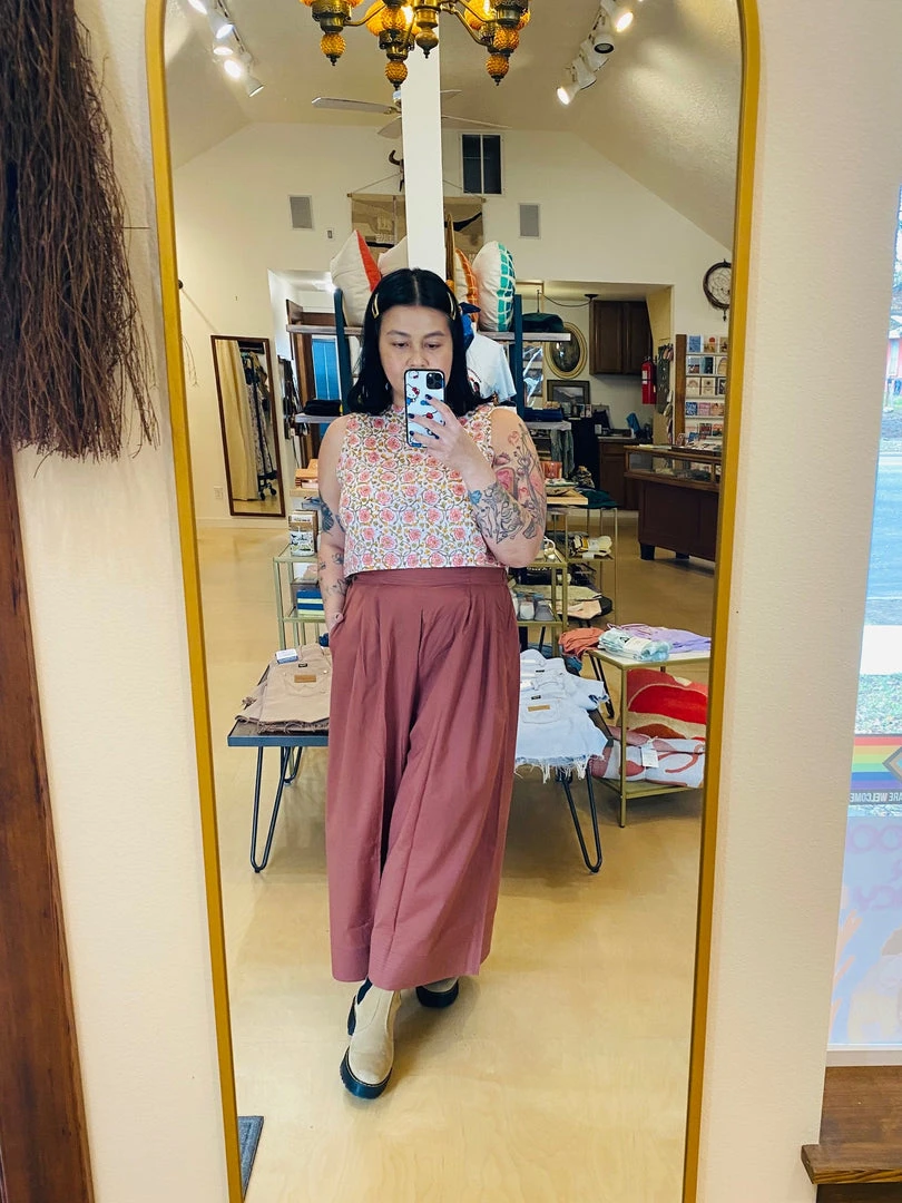 A pant that is both comfortable and chic. Side pockets, elastic back waist, wide leg, and mid rise. We love pairing the Fleur pant with Maelu’s crop top for the perfect mix of textile goodness.
