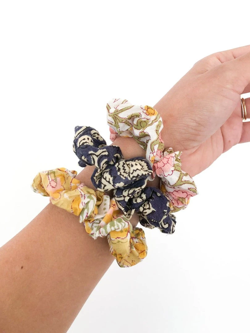 Assorted block print scrunchies in: Yellow, Blue, White/Pink