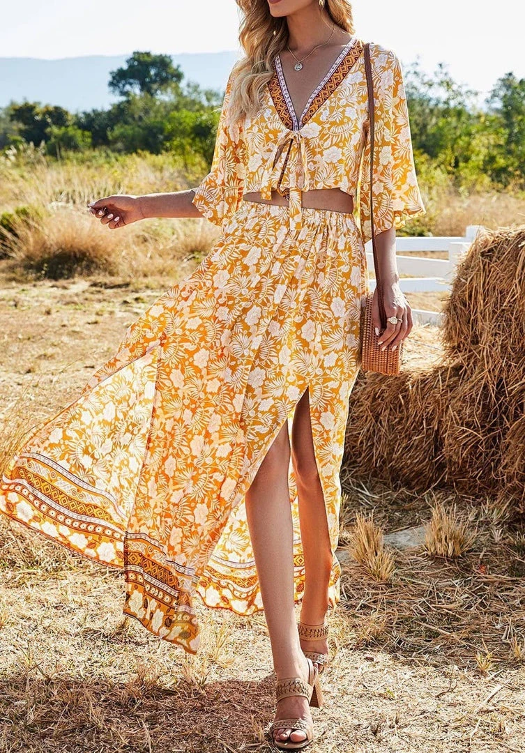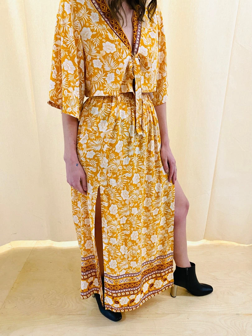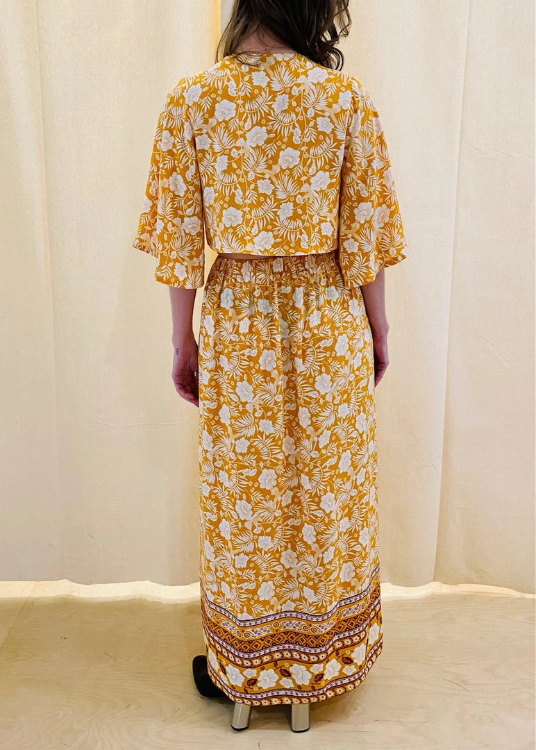 Floral print Blouse and Skirt set. Blouse is cropped with a self tie on front. Maxi skirt is elastic with two front slits.