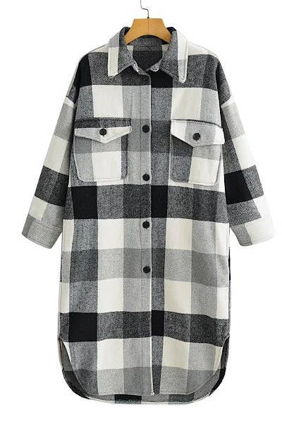 Long flannel jacket in grey and black plaid with side pockets, flap chest pockets and button up closure.