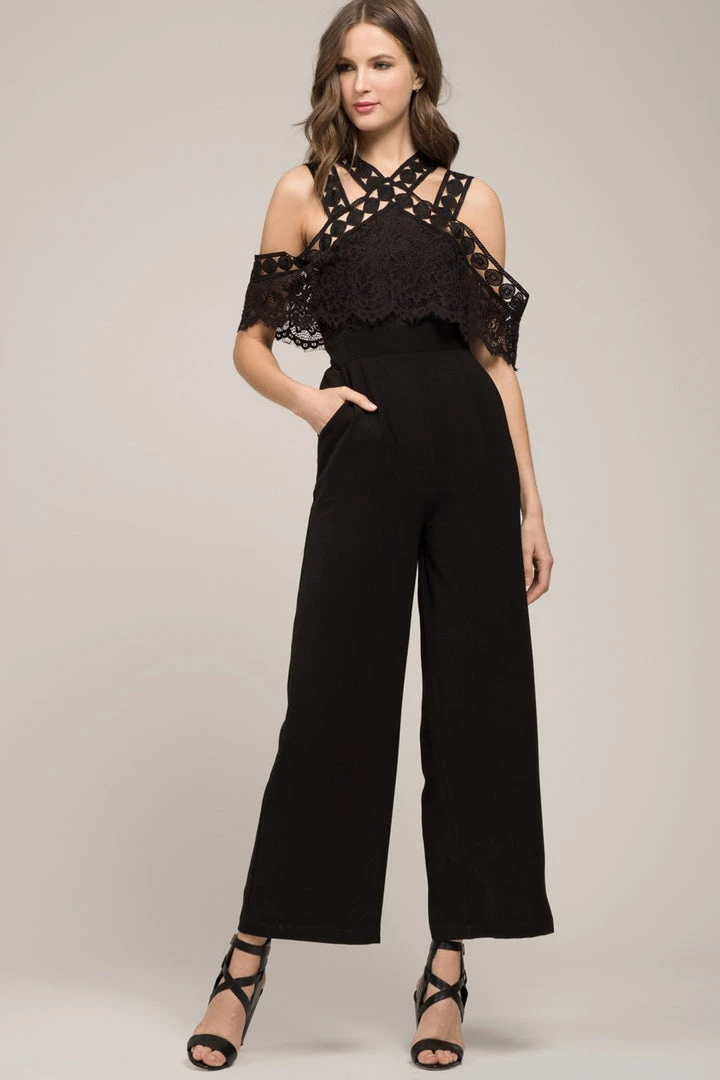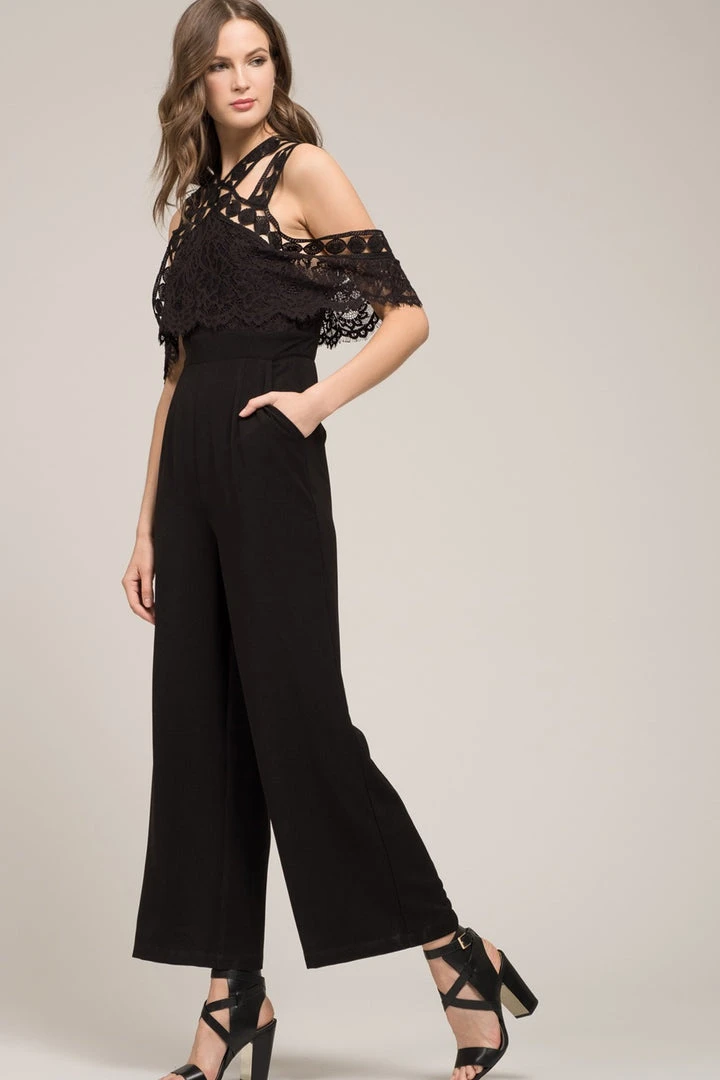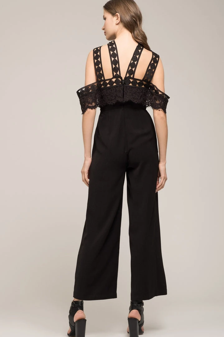 From Moon River. Cold shoulder jumpsuit in black with lace detail. Back zipper and side pockets.