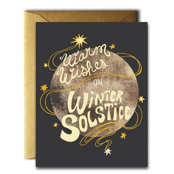 A whimsical and earthy card celebrating the essence of the season! Full color card printed on 100# cream card stock Printed in Atlanta, GA Folded A2 (4.25″x5.5″), blank interior Comes with an antique gold envelope that was produced in the US using renewable energy sources.