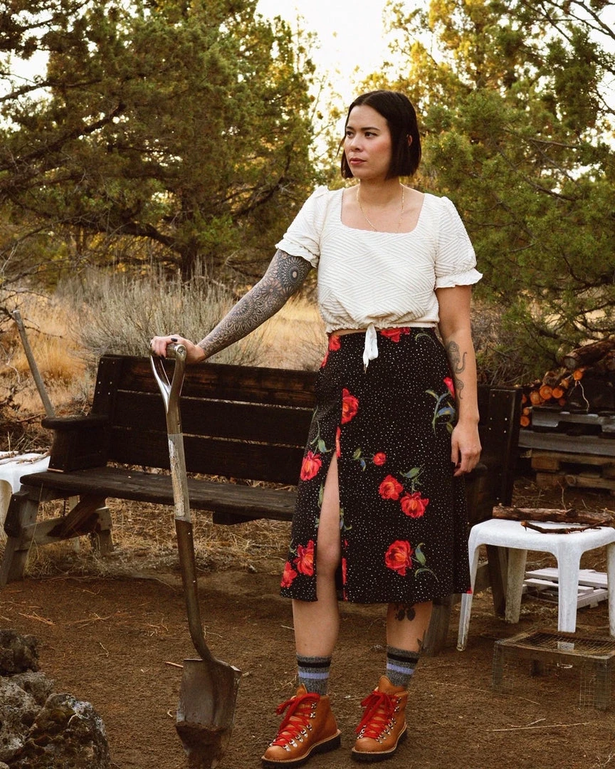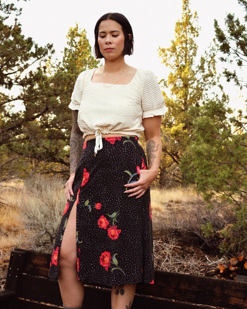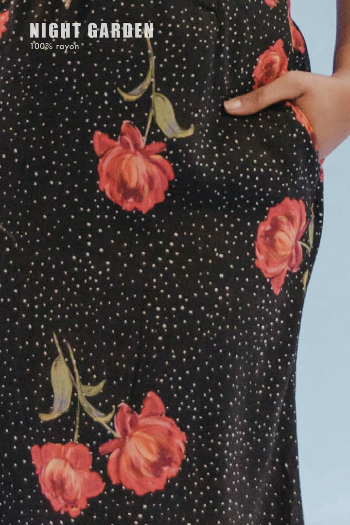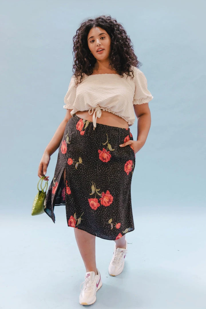 The perfect Midi Skirt is here. A slit to show just the right amount of leg, pockets for snacks, and small ties at the back waist for the perfect fit. The perfect closet staple in black, Purr, and Night Garden, hand drawn by female artist @yellowandlace.