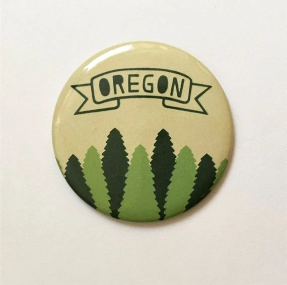 This magnet features a tribute to the state of Oregon, with an overhead banner proclaiming the state’s name in green and silhouettes of evergreen trees in various shades of green underneath over a tan background.
