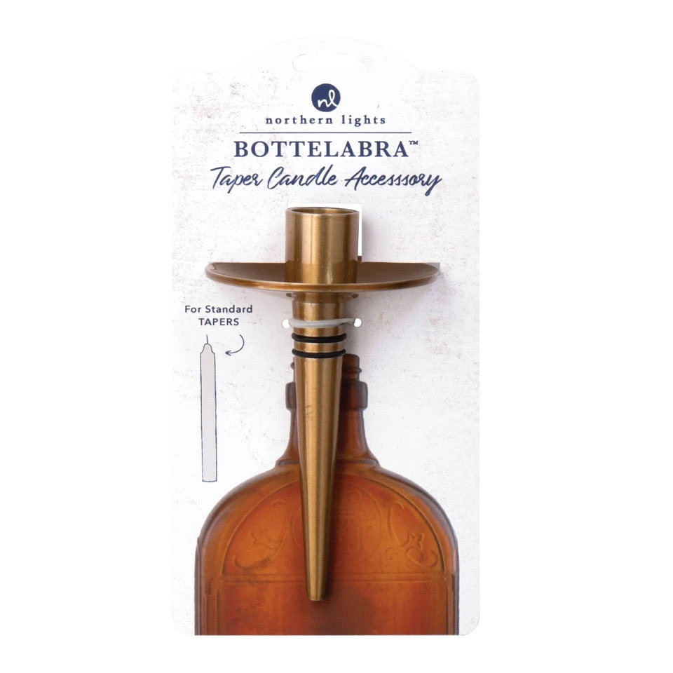 Turn your favorite wine bottles into distinctive candelabra with our Bottelabra candle accessories. Designed to hold tapers, they are easy to use. Just push into almost any empty wine bottle; the rubber rings ensure a secure fit. Bottelabra are made of cast aluminum and designed to hold taper candles securely. Product Details: 3.25in x 5.5in.