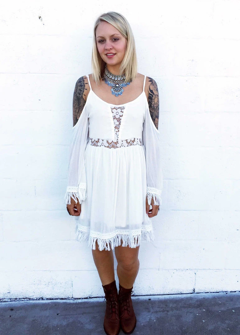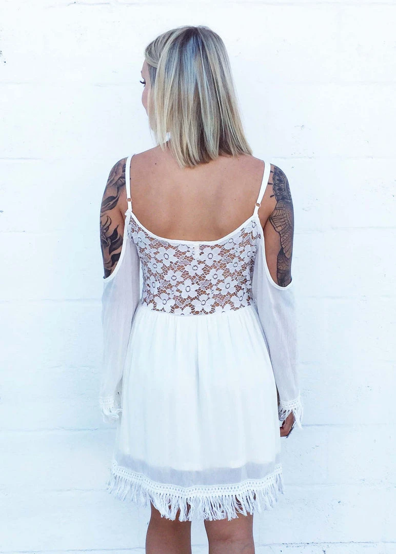 Cold shoulder lace dress from Raga LA. Side zipper, lace paneling and fringe detail at sleeves and hem.