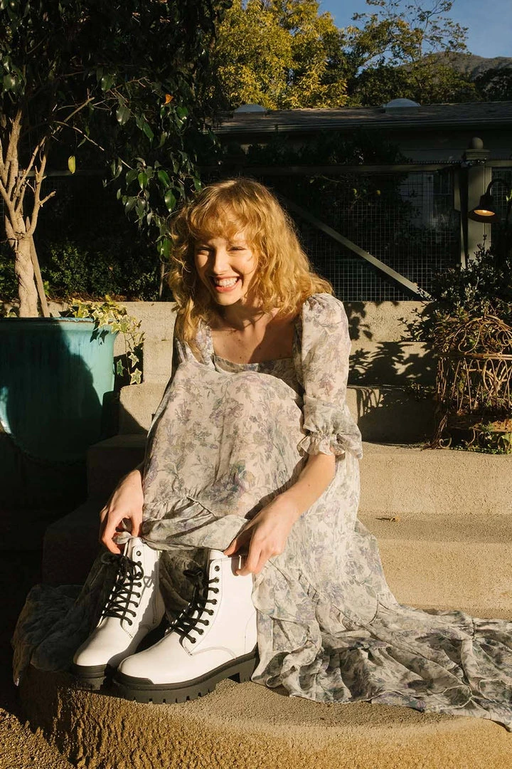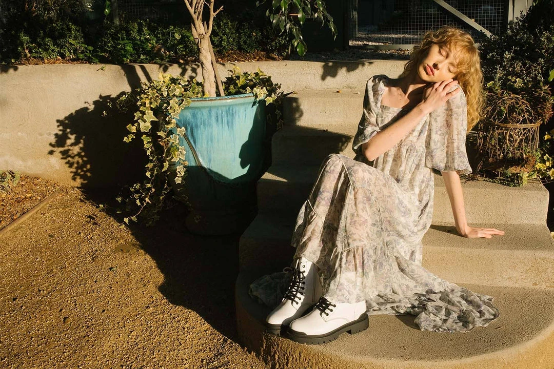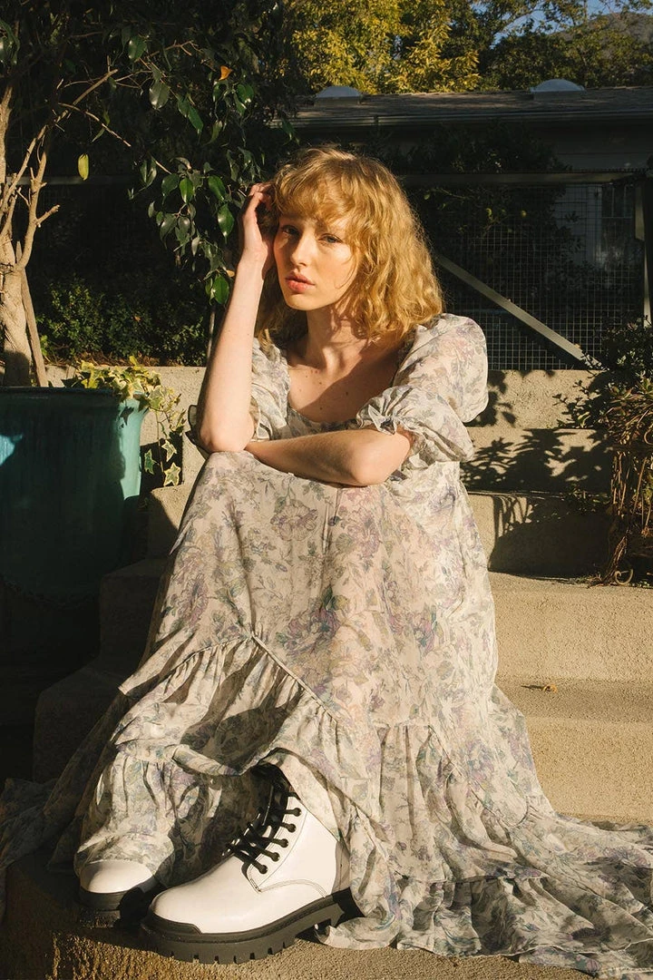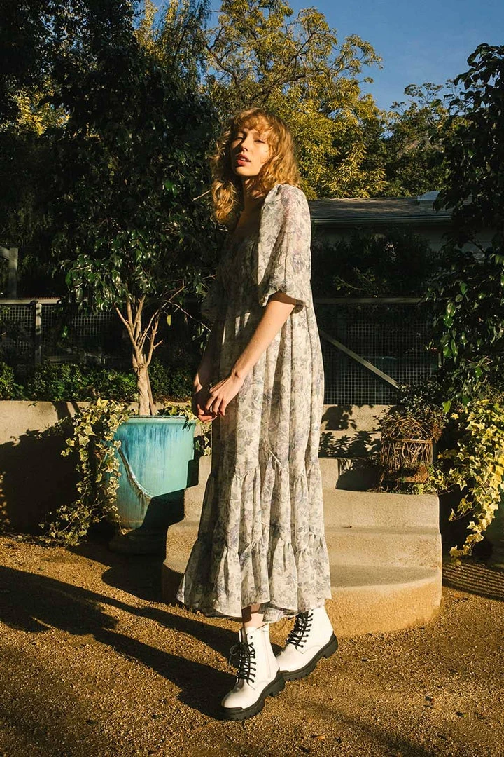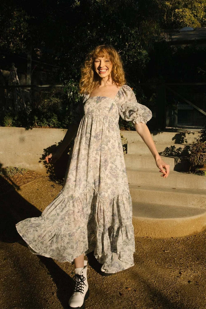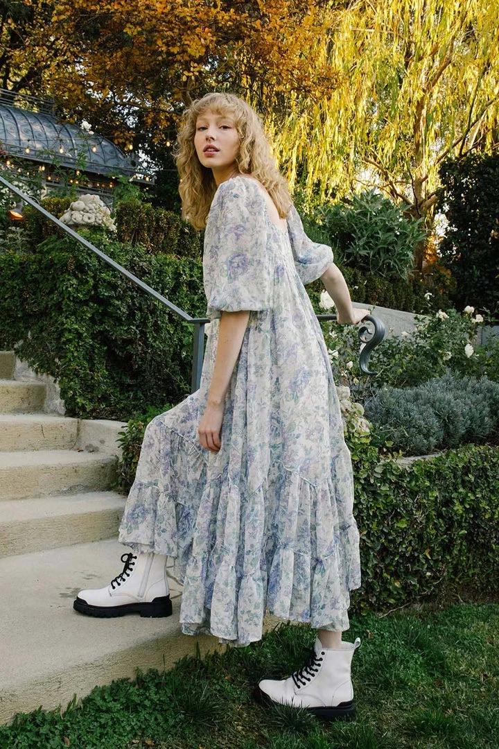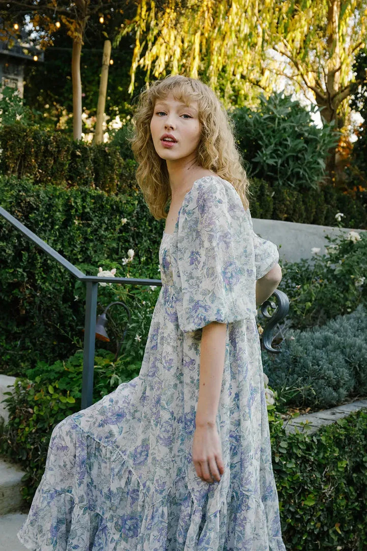 Retro cottage floral print baby doll maxi dress. It displays a front/back square neckline, 3/4 puffy sleeves with ruffled cuffs, and two bust darts. It also has a gathered cinched empire waist, followed by a maxi bottom and an asymmetrical ruffled flowy hem.