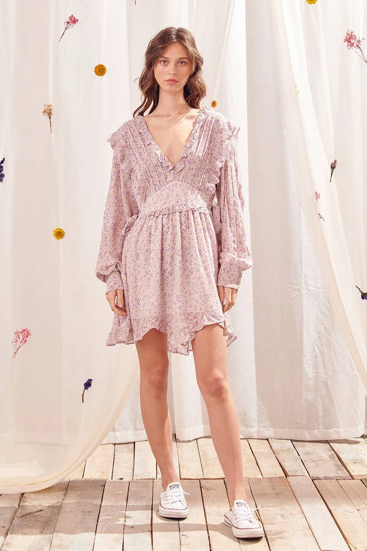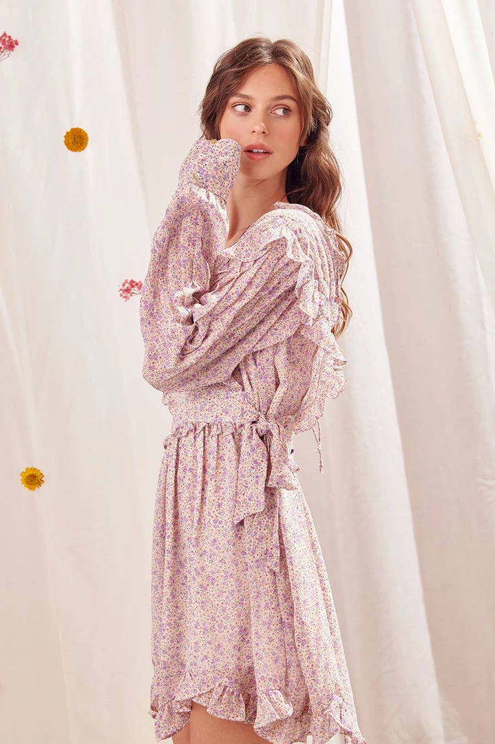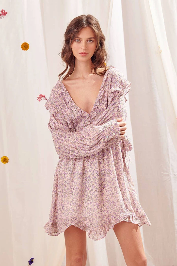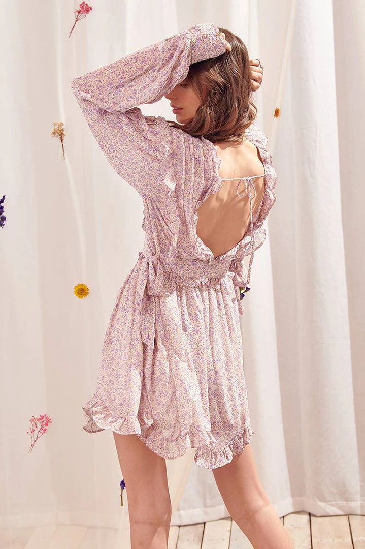 Ditsy floral empire waist mini dress with a v neckline, open deep v back with a self-tie ribbon across the opening and asymmetrical ruffled hemline.