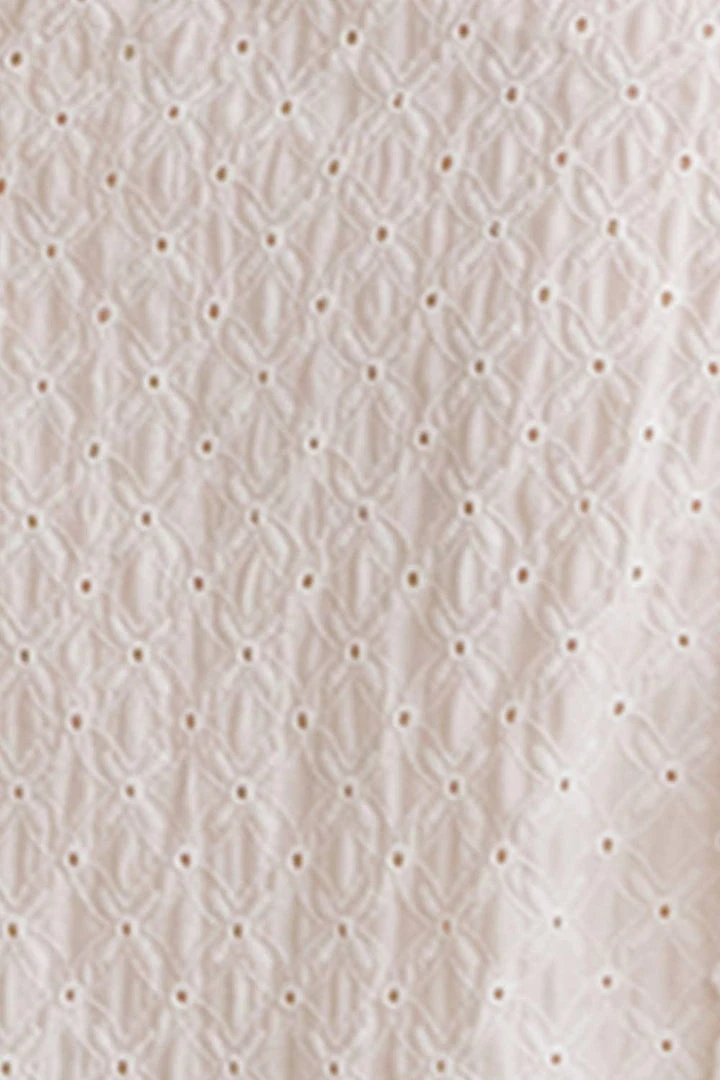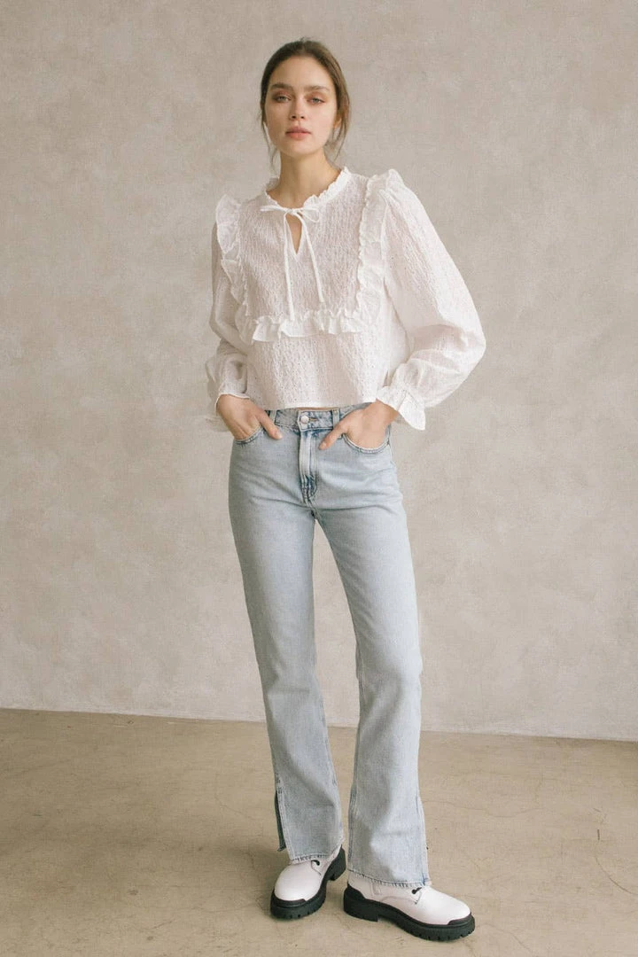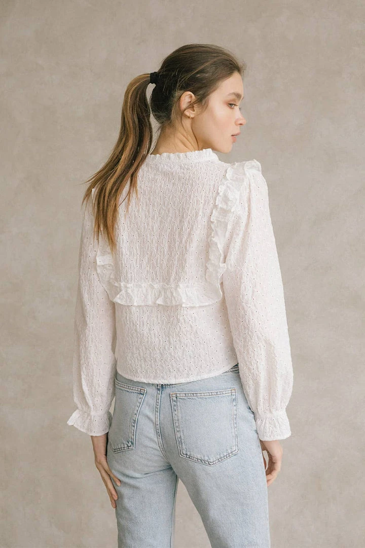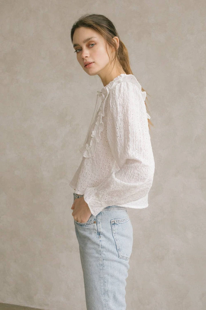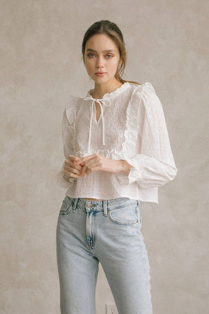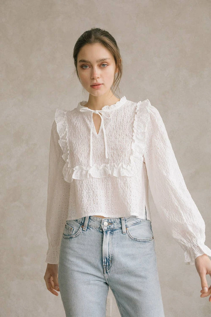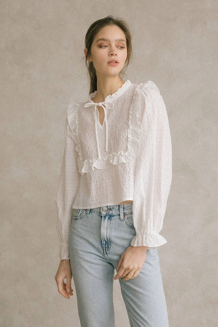 Monochromatic eyelet ruffled blouse. Featuring a crew neckline with string-tie, front peekaboo hole, and front/back bib ruffles. It also has long sleeves with ruffled cuffs and a dolphin hem.