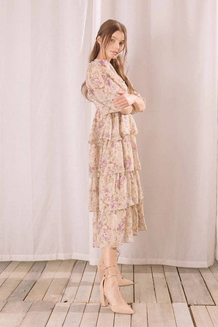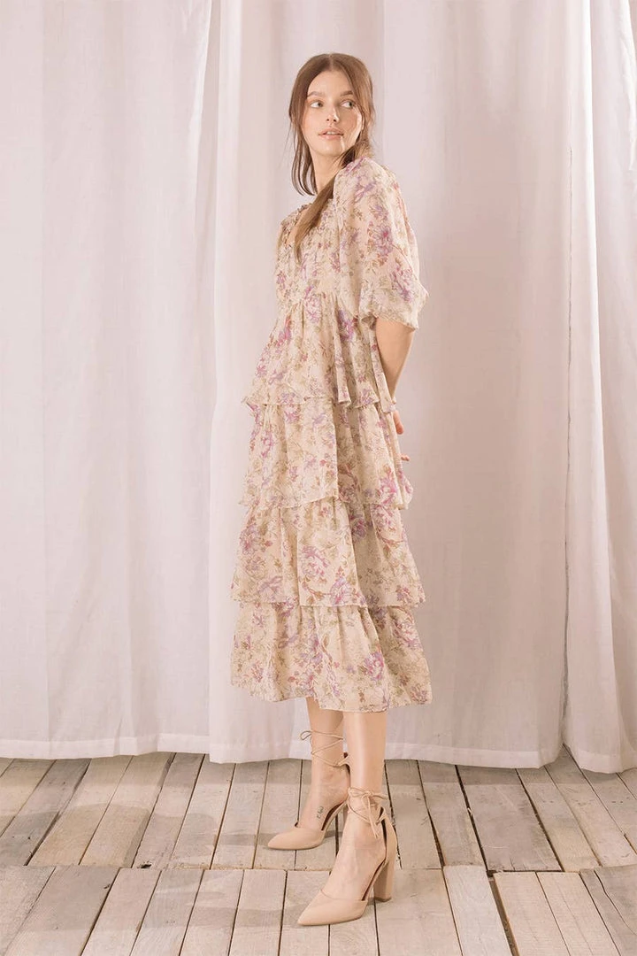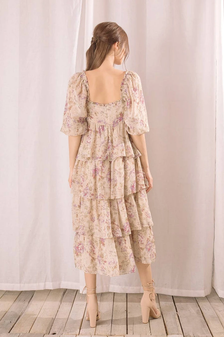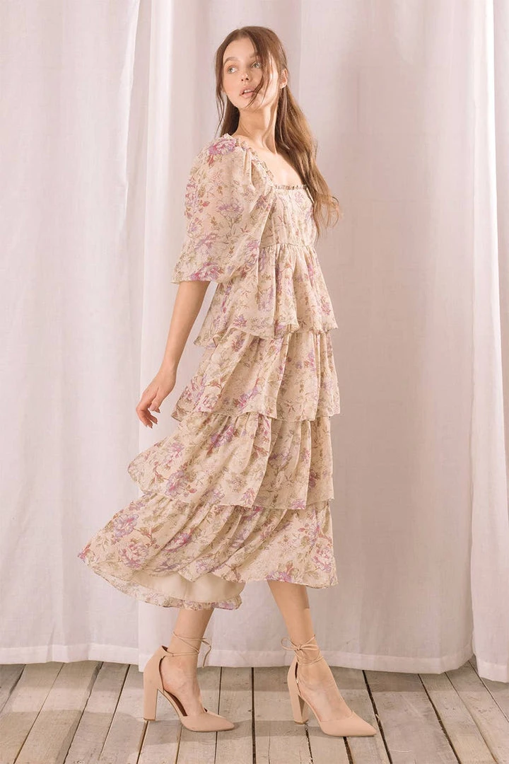Flower print baby doll midi dress. It features a front/back square neckline with ruffled edge trim, 3/4 puff sleeves, and two front chest darts. It also has a tiered ruffled layered body and a zipper for off/on access.