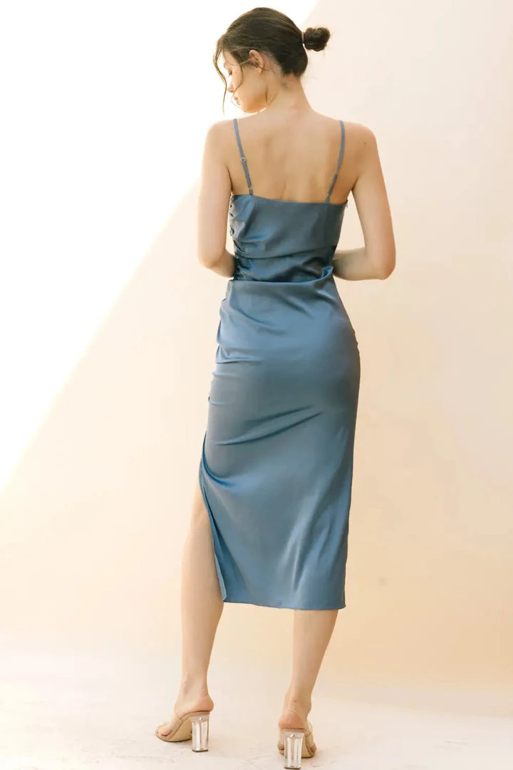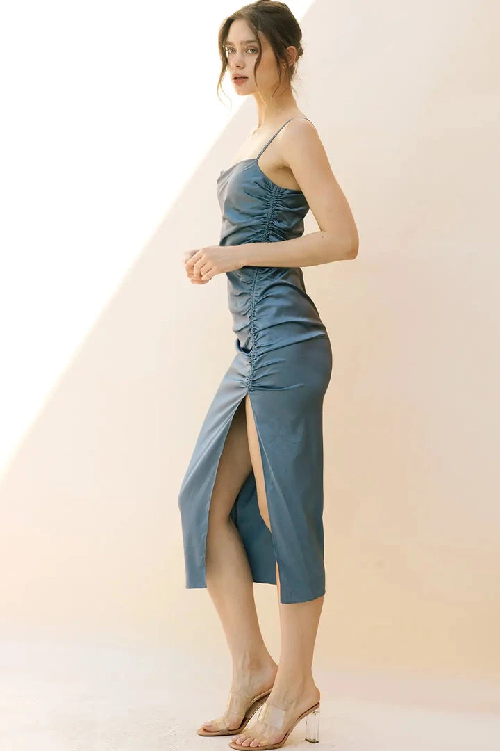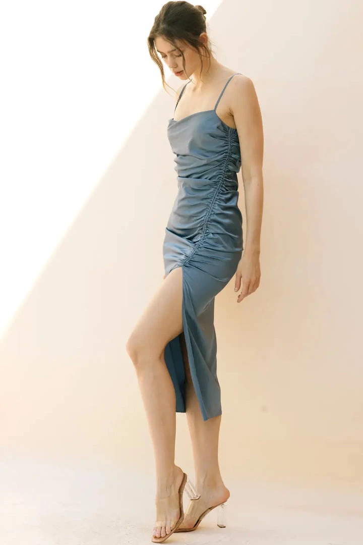 Monochromatic satin bodycon midi dress featuring a cowl neckline, adjustable spaghetti straps, and cinched waist. It also has a drawstring left ruching, leg slit, and side zipper.