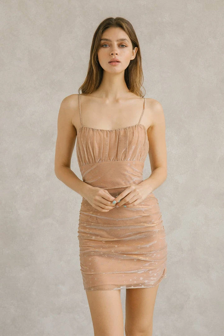 Star print and a silver metallic sheen mini dress with a straight neckline, side zipper, and ruching going along the sides of the dress. It also shows gathered ruching on the upper chest/back, sheer light fabric with underlining, and adjustable spaghetti straps.