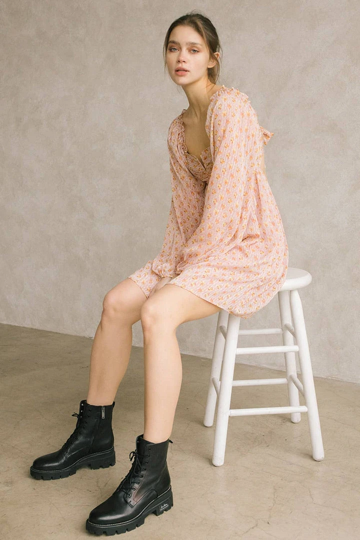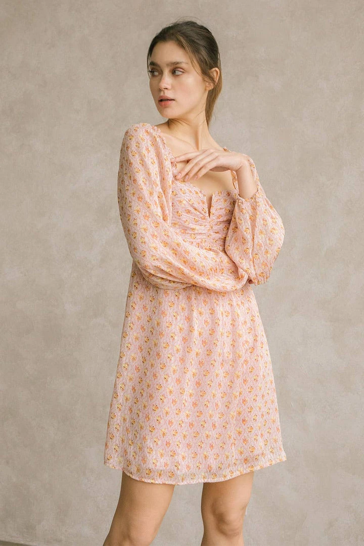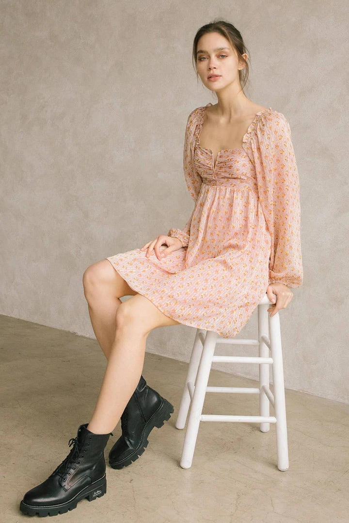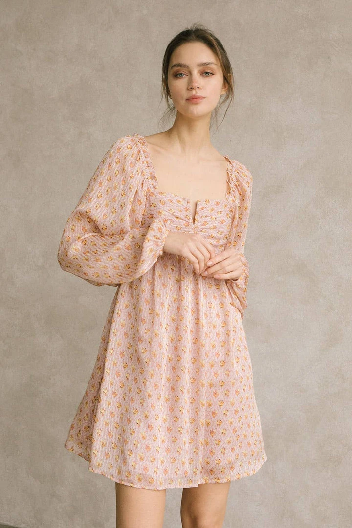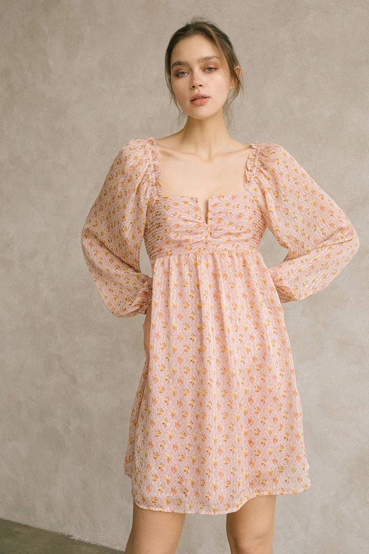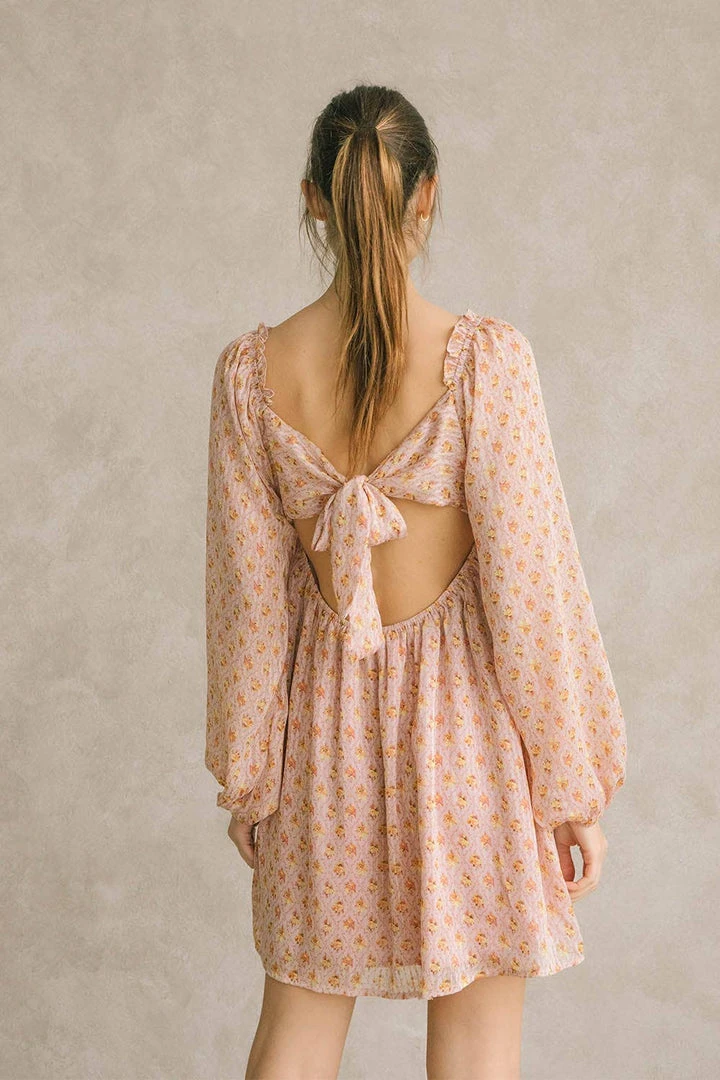 Yellow rose floral mini dress. Featuring a square neckline with a boned v front, empire, gathered cinched waist. It also has long sleeves, a-line mini bottom, and an open back with center back bow detail.