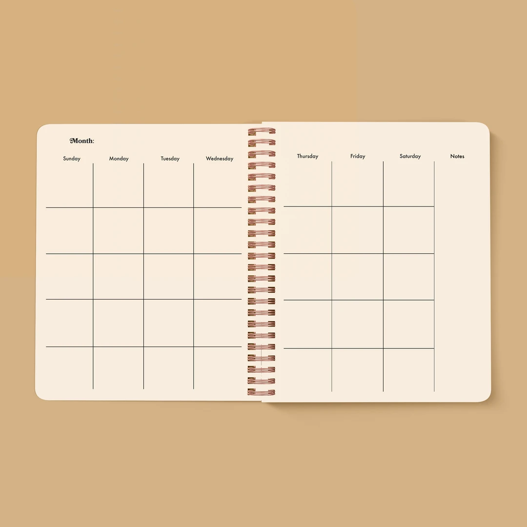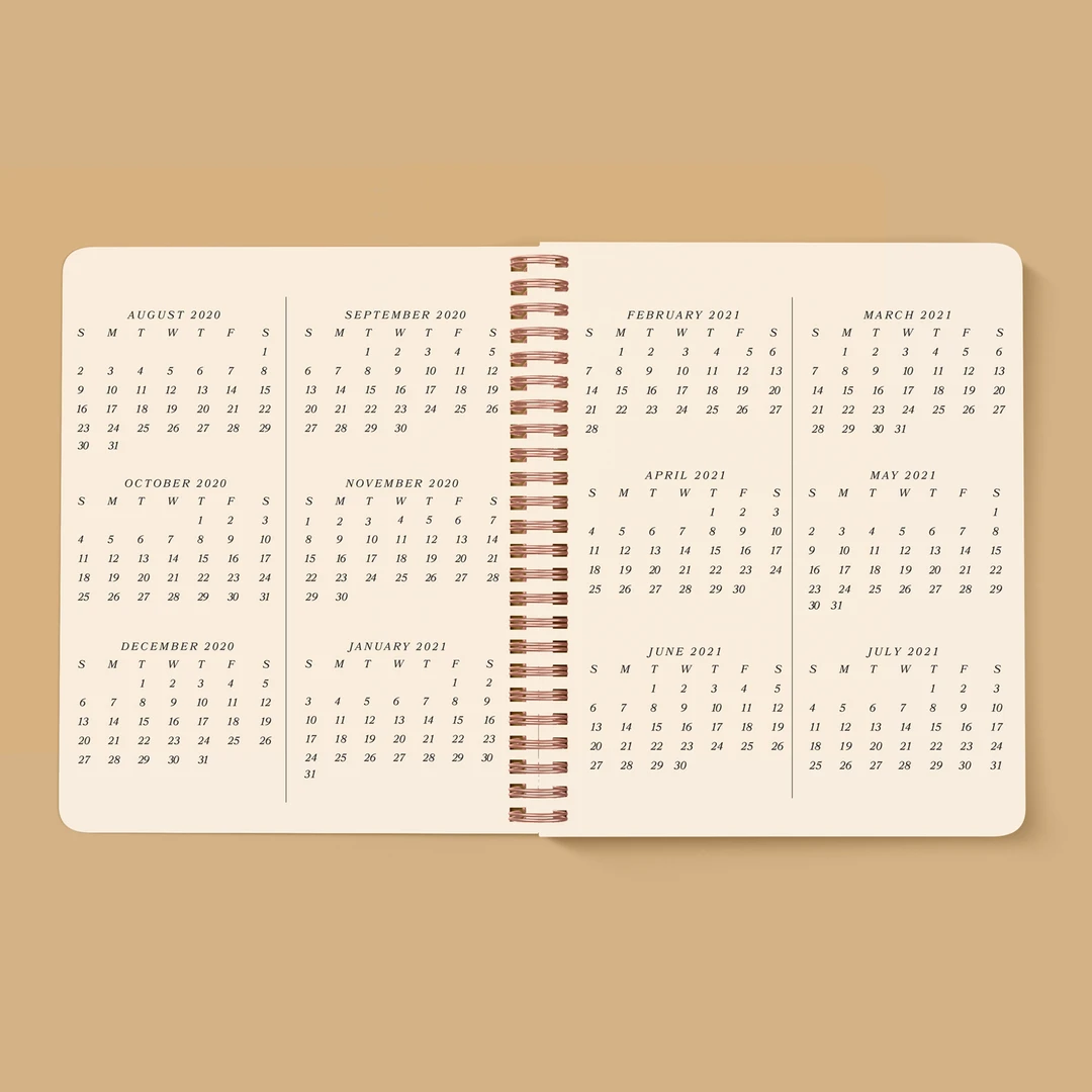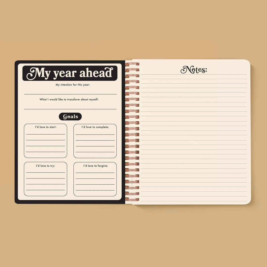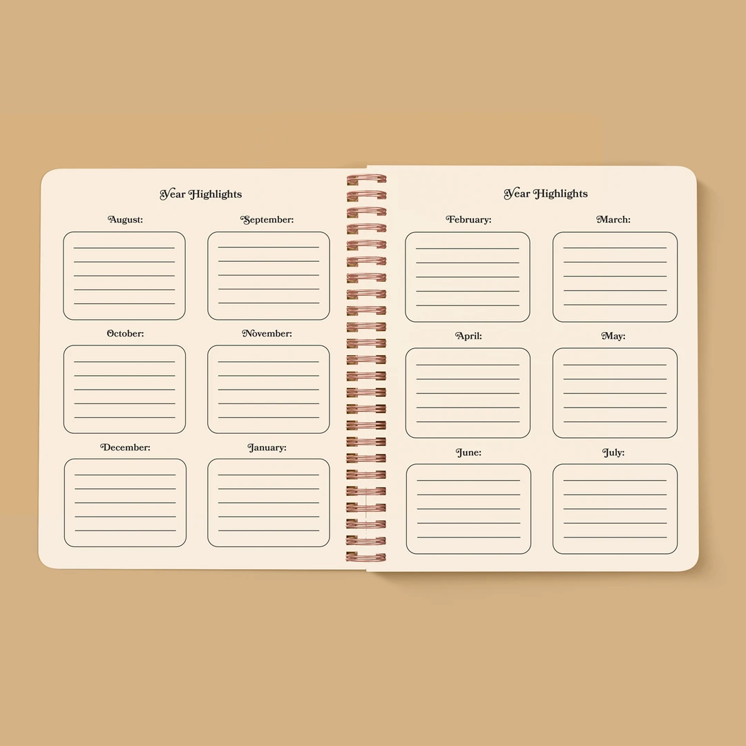 – Year at a glance, including a section for intentions & goals – Inspirational artwork and phrase at the beginning of each month section