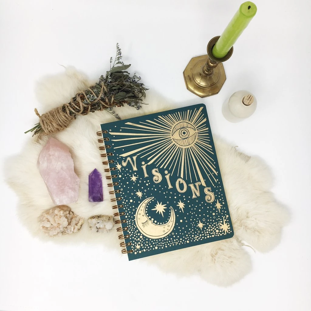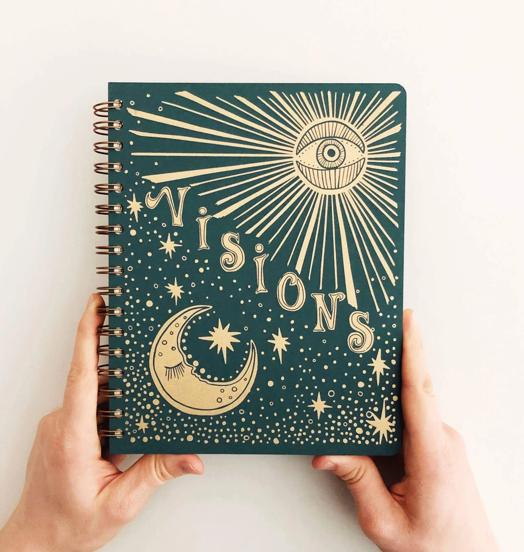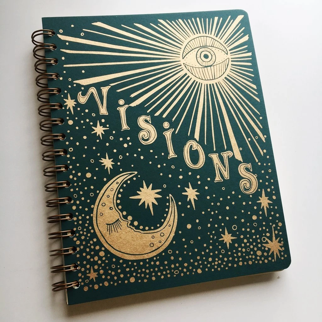 Introducing the spiral journal. “Visions” design printed on a spruce green cover. Sturdy lined book for you to use as a journal. Stocked with 200 blank pages so you can really put it to good use!Â