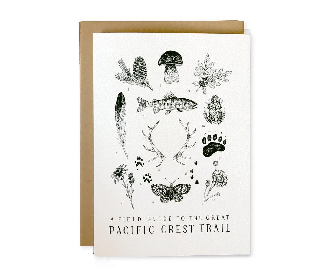 The Pacific Crest Trail Field Guide card is an elegant way to celebrate the outdoors. A blank interior makes these cards perfect for any occasion, and the 5×7″ size doubles as framable art. Each card features flora and fauna carefully illustrated by hand, with a full species list on the back of each card. They are printed on an off-white felted paper for a rich texture, and paired with a kraft envelope.