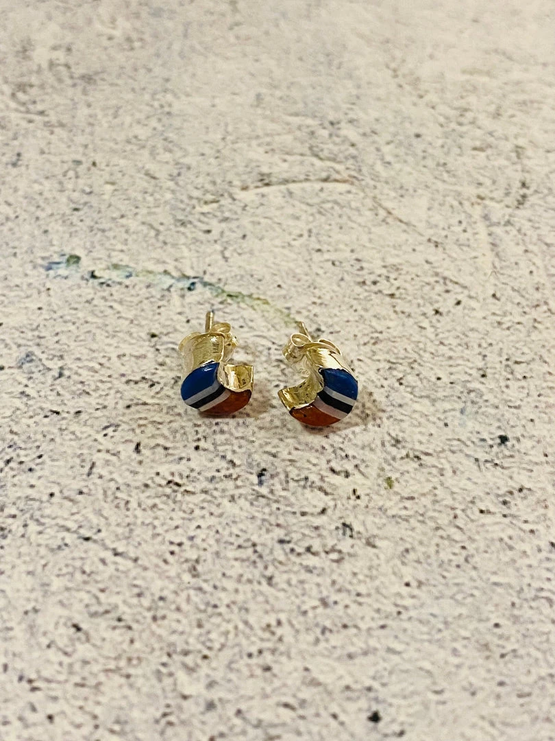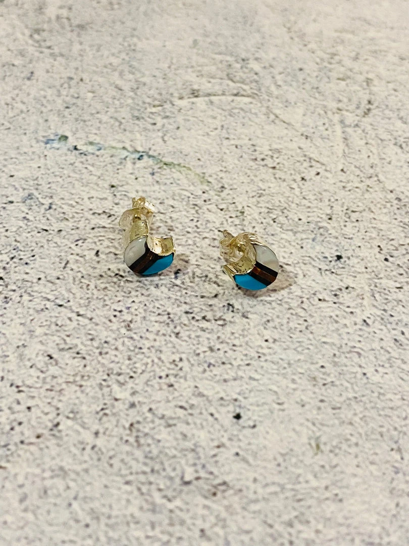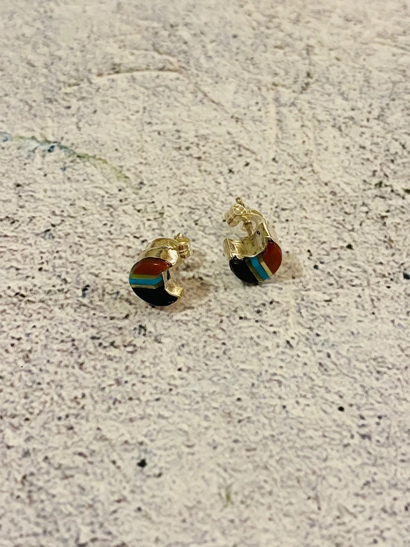 These crescent moon earrings are inlaid with multi colored stones on sterling silver. Measures approximately 1/4″ long by 1/8″ wide.