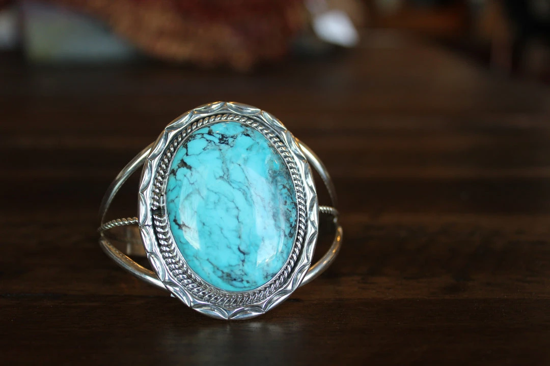 Sterling silver bracelet with large turquoise stone, scalloped stamping and twist wire.