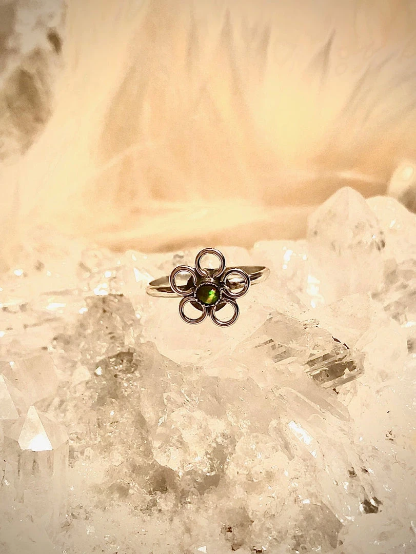 Sterling silver flower design and with handcut opal stone in the center.  Top of ring measures approximately 3/8″ in diameter.