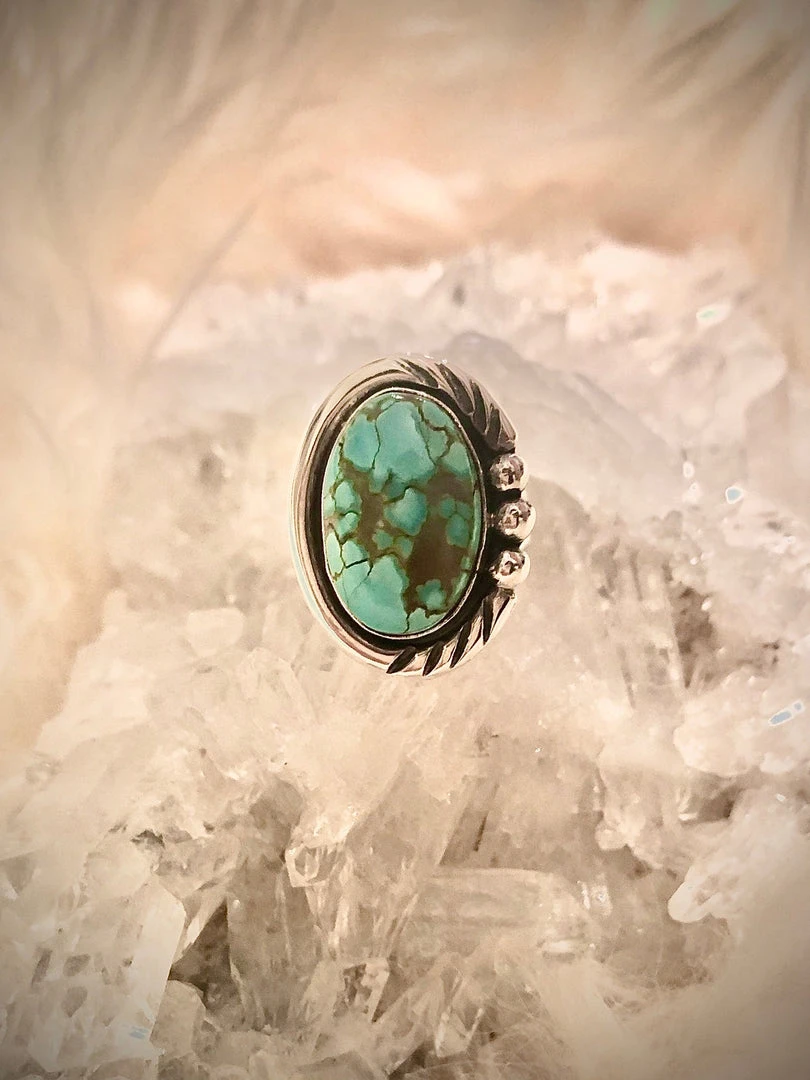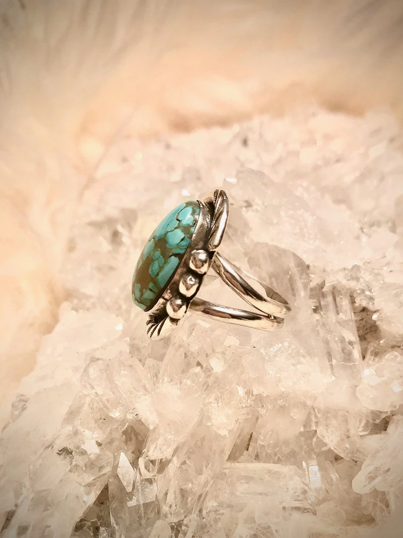 A free form oval Pilot Mountain turquoise stone set in sterling silver with plain, stamped and drop border on a double wire split shank. Top measures approximately 1 1/8″ long by 7/8″ wide.Â