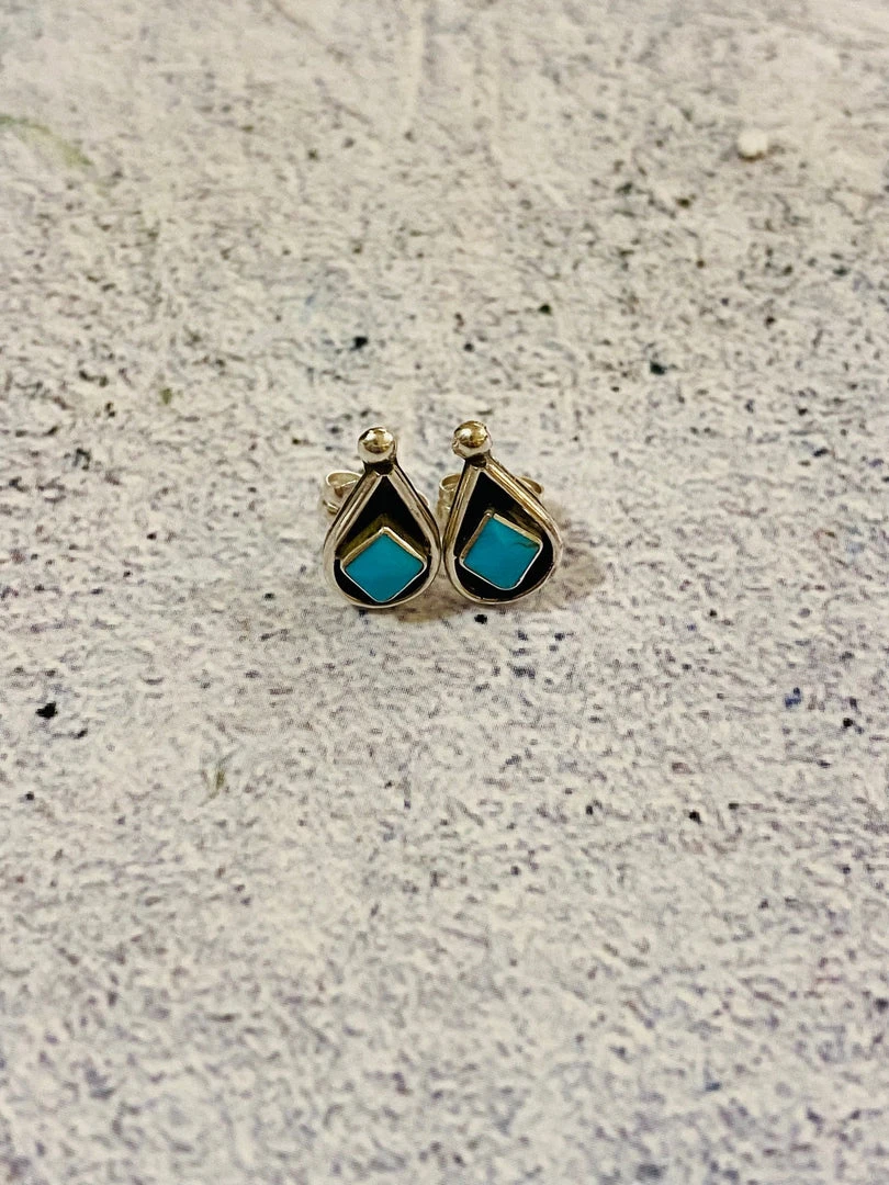 These crescent moon earrings are inlaid with multi colored stones on sterling silver. Measures approximately 1/4″ long by 1/8″ wide.