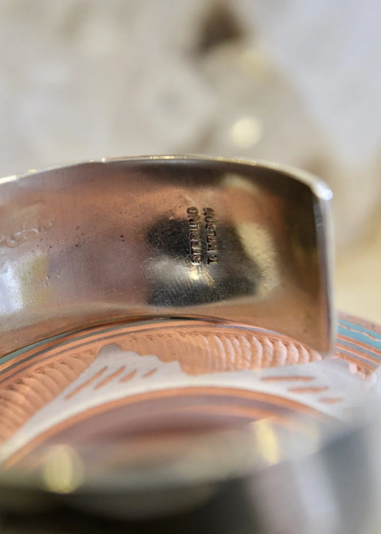 New Mexico found dead stock sterling silver stamped bracelet with bear design. Slightly over 3/4″ wide, 6 1/4″ long.
