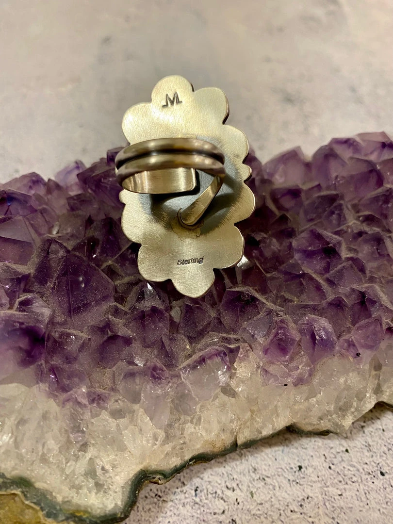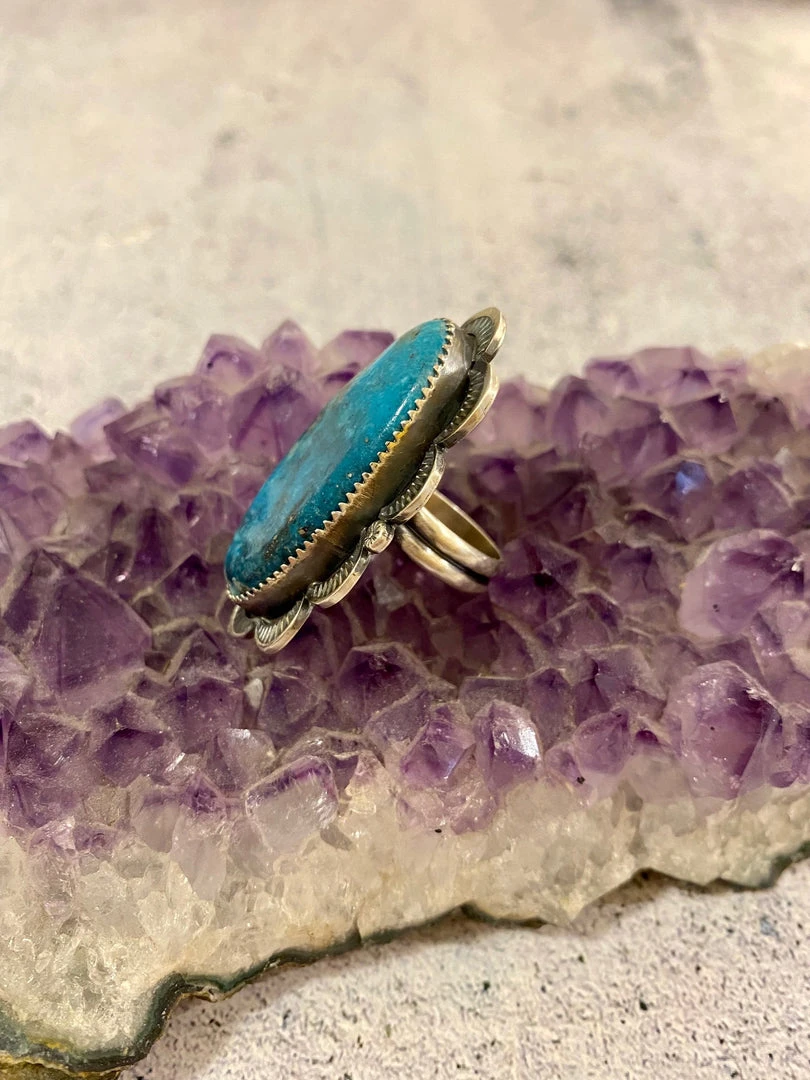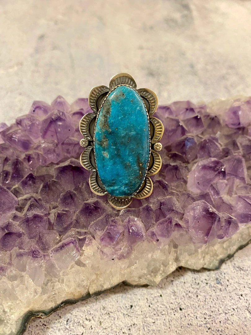 Sterling silver ring with a medium size free form Kingman turquoise stone and a stamped scalloped border. It is all on a double wire adjustable shank. (Split on one side and closed on the adjustable end). Top measures approximately 2″ long by 1 1/8″ wide. Â