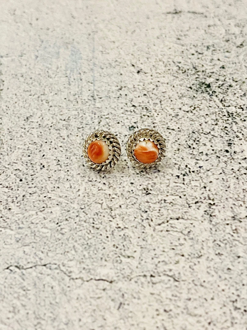 Sterling silver, round post earrings with spiney oyster inlaid and rope wire border.  3/8″ Diameter Navajo handmade. |