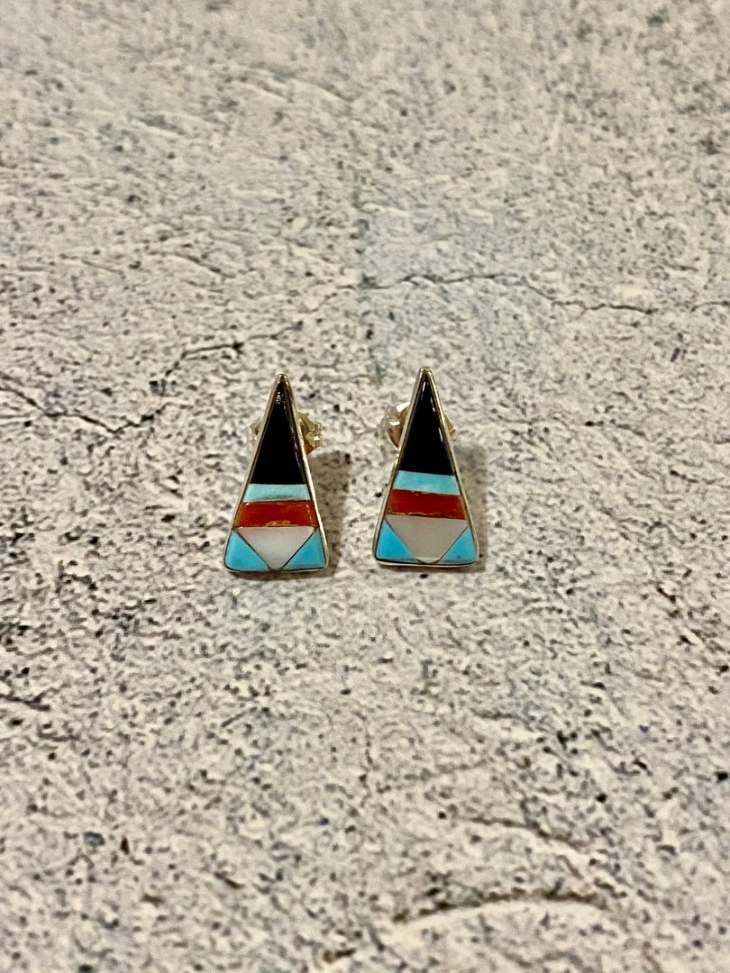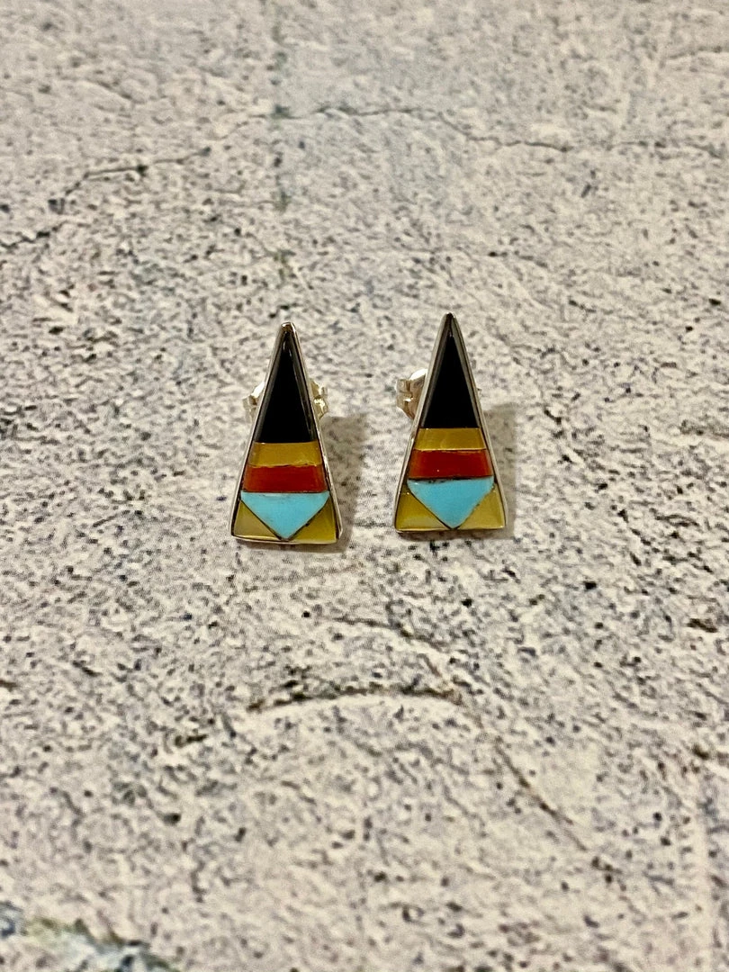 Sterling silver post earrings with traditional color inlay in a triangle shape. It measures approximately 5/8″ long by 5/16″ wide at widest. Post is towards the top tip.